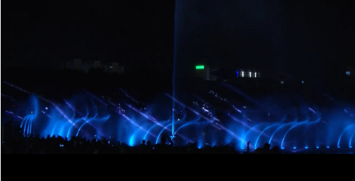 該音樂噴泉長110米,寬20米,運(yùn)用了3D高清激光投影水幕電影、大功率全彩激光掃描數(shù)控?fù)u擺噴泉、變頻跑泉等國際最先進(jìn)的水秀科技,多種多樣的圖案及色彩光束照射在晶瑩透明的噴泉水幕上,呈現(xiàn)一個如夢似幻的世界。